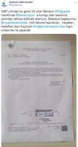 "35 yıldır, kamuya hiç yük olmadan 15 tane çalışanına istihdam yaratan, kirasını düzenli ödeyen, vergi veren Türkiye Tenis Kulübü'ne bağlı Samsun Tenis Külübü çalışanları, antrenörler, öğrenci stajyerler, tenis sporuna gönül vermiş düzenli spor yapan Samsun halkı şimdi mağdur olmuyor mu? Belediye başkanımız Sayın Mustafa Demir 'Doğupark'ta bir millet parkı projesi olmayacak. Samsunspor Nuri Asan Tesisleri yerinde kalacak. Mevcut şekli ile devam edecek' diye sözü vermişken, Samsunspor'a komşu olan Samsun Tenis Kulübü neden alelacele tahliye edilmek isteniyor. Samsuna ve Samsunspor’a gönül vermiş tüm Samsun halkından destek istiyoruz. Tenis Kulübü, Samsun halkınındır. Şehrimize ve değerlerine hep birlikte sahip çıkalım."