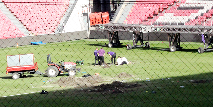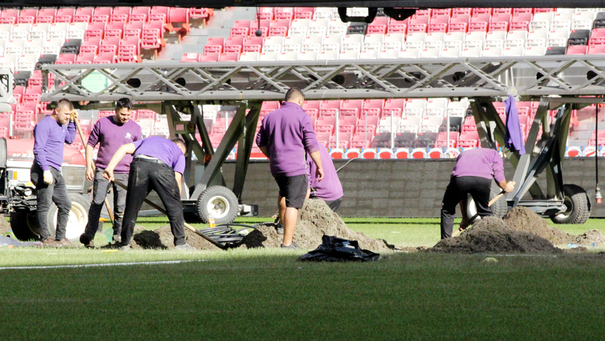 YOĞUN MESAİ HARCANIYORYapılan yanlışın ardından yoğun mesaiyle çalışan firmanın yetkilileri ilk olarak zemin altında biriken suları boşalttı. Ardından hibrit çim dikilirken delinen boruları yenilenirken, zemin yerleştirme çalışmaları hızlandı. Son etapta hibrit çim dikme işlemleri yapılarak sahanın Alanyaspor maçına hazır hale getirileceği ifade edildi.