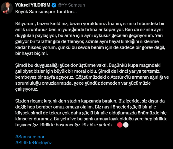 Trendyol Süper Ligi'nde ikinci yarı hafta sonu başlayacak. Samsunspor Başkanı Yüksel Yıldırım da, hafta sonu oynanacak Gençlerbirliği maçı öncesi camiaya seslendi. X hesabından açıklamalarda bulunan Başkan Yıldırım önemli mesajlar verdi. İşte Yıldırım'ın paylaşımı:KIRILDINIZ, YORULDUNUZ...